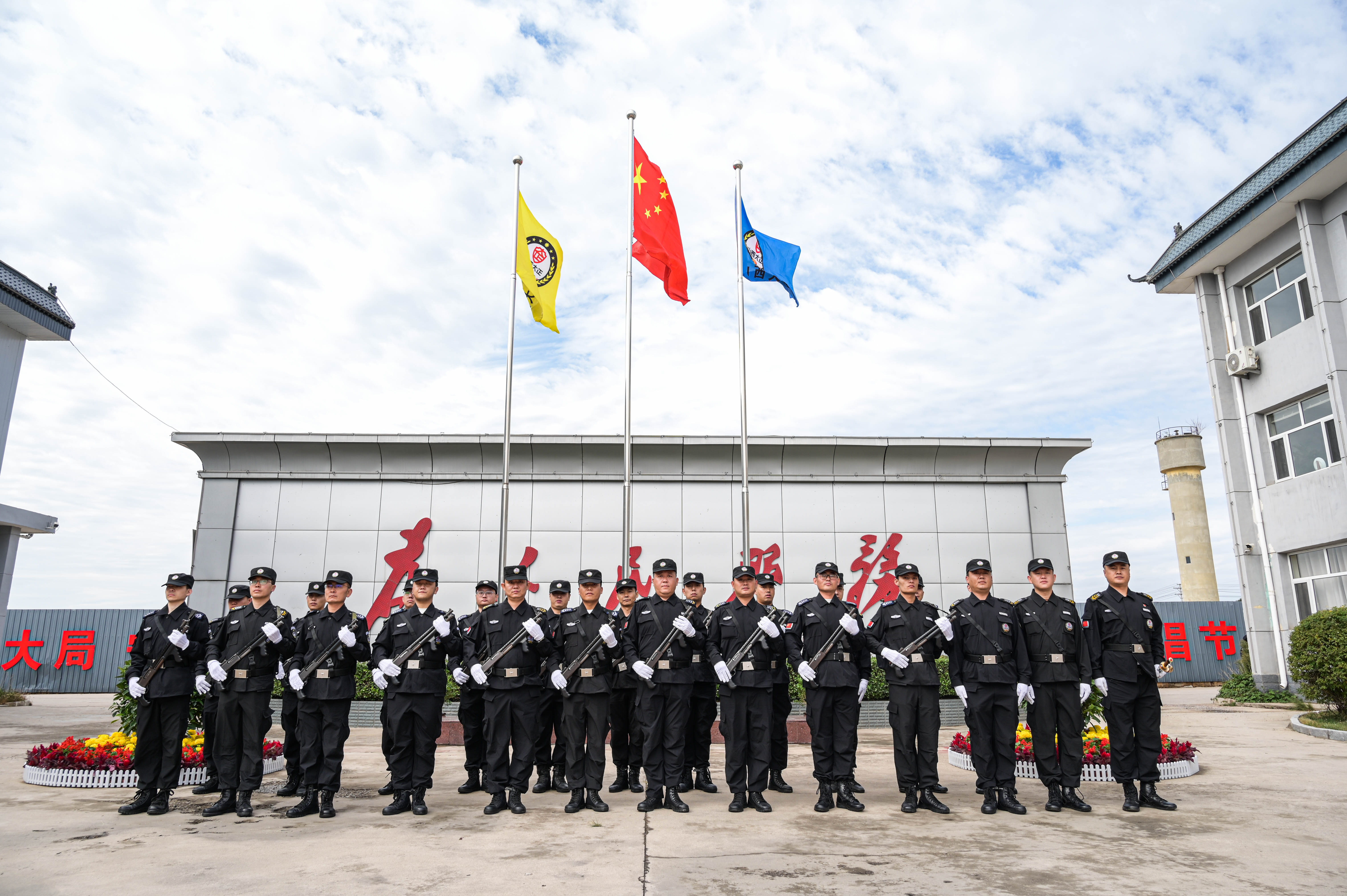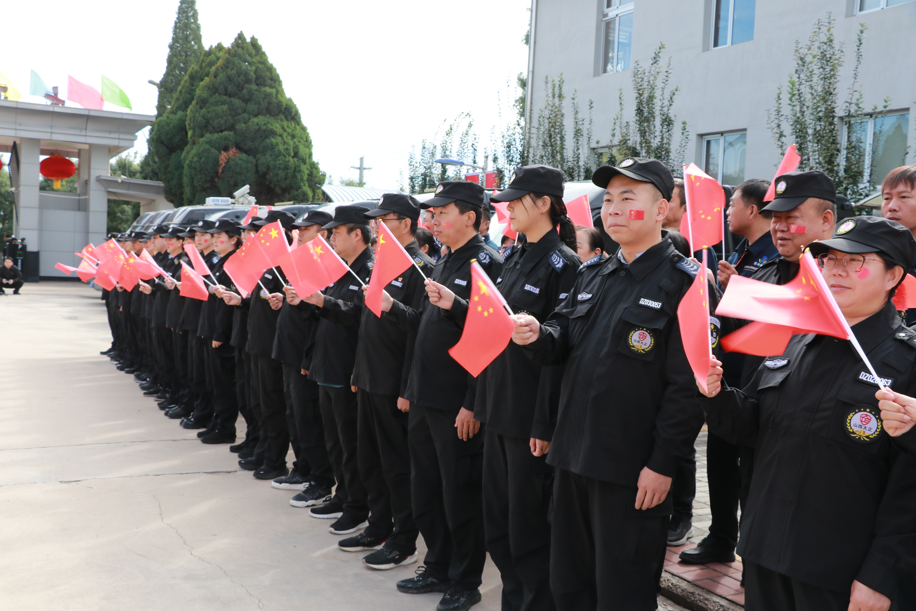節(jié)日的公司院內(nèi)外,四周花團錦簇,大門口燈籠高掛、彩旗飄揚,為節(jié)日增添了濃厚的喜慶氛圍。公司運鈔車、巡邏車、運兵車干凈整潔,排列在場地兩側(cè),升旗儀式更顯隆重。9時30分,集團公司、各子公司領(lǐng)導(dǎo)和機關(guān)各部門、城區(qū)員工共300多人整齊列隊,懷著激動的心情,手持小國旗,臉上貼著愛國貼紙、洋溢幸福的笑容,眼神中充滿了對祖國的熱愛和對升旗儀式的期待。