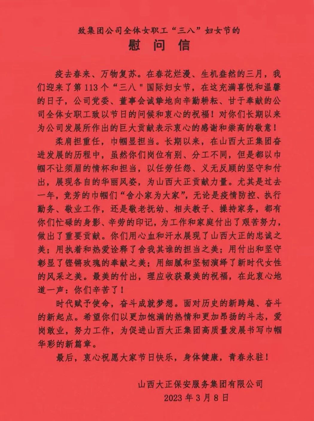 在第113個國際婦女節(jié)也是我國第100個婦女節(jié)到來之際,山西大正保安服務(wù)集團有限公司向公司所有女同胞們致以節(jié)日的問候和美好的祝愿!向所有辛勤耕耘、默默奉獻在大正各個崗位上的姐妹們表示親切的問候、崇高的敬意!