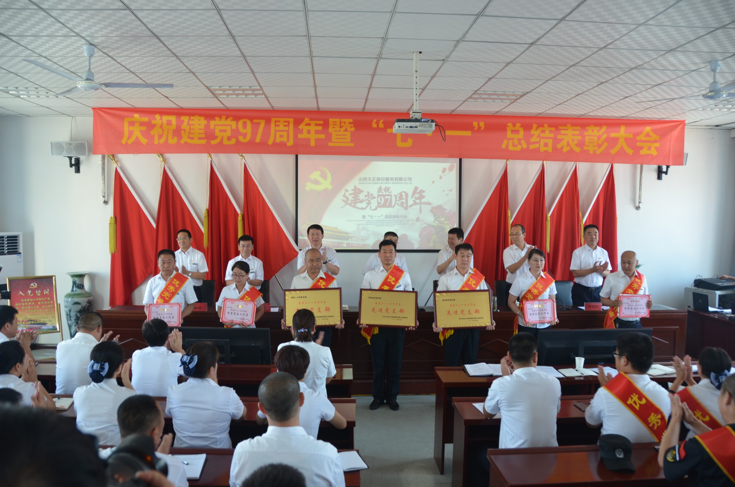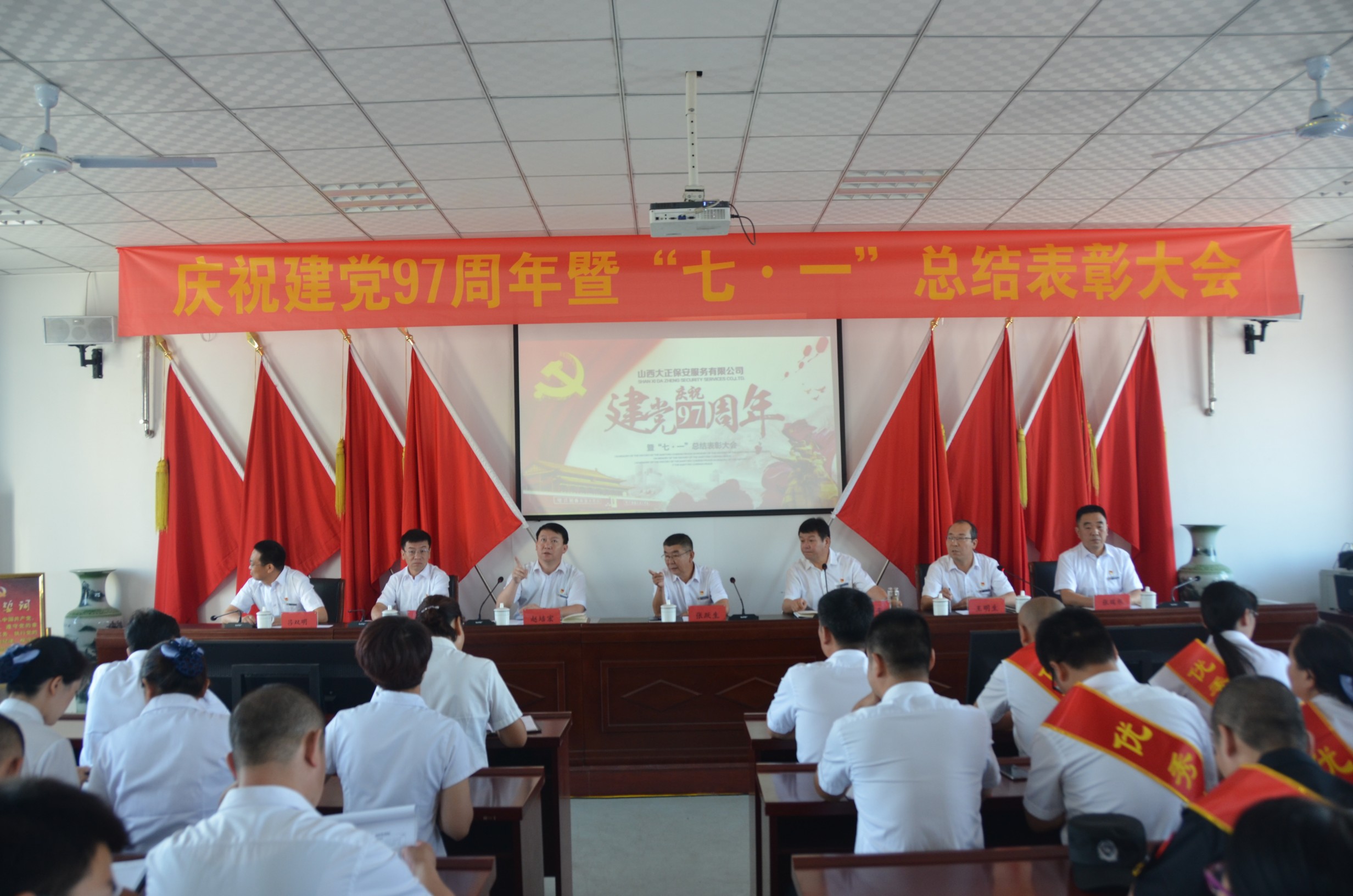 為慶祝建黨97周年,回顧總結(jié)公司一年來黨建及其它各項工作取得的新進(jìn)展、新突破、新成果,安排部署下一階段黨建及其它各項工作,6月30日上午9時,山西大正保安服務(wù)有限公司在總公司會議室隆重召開了“慶祝建黨97周年暨“七·一”總結(jié)表彰大會”?偣靖鞑块T、各分公司、各縣、市、區(qū)基層中隊分別在主會場、分會場收聽、收看了大會實況。出席大會的領(lǐng)導(dǎo)有張躍生、陳志平、趙培宏、王雙明、邢春生、張瑞東、呂雙明,大會由王明生同志主持。