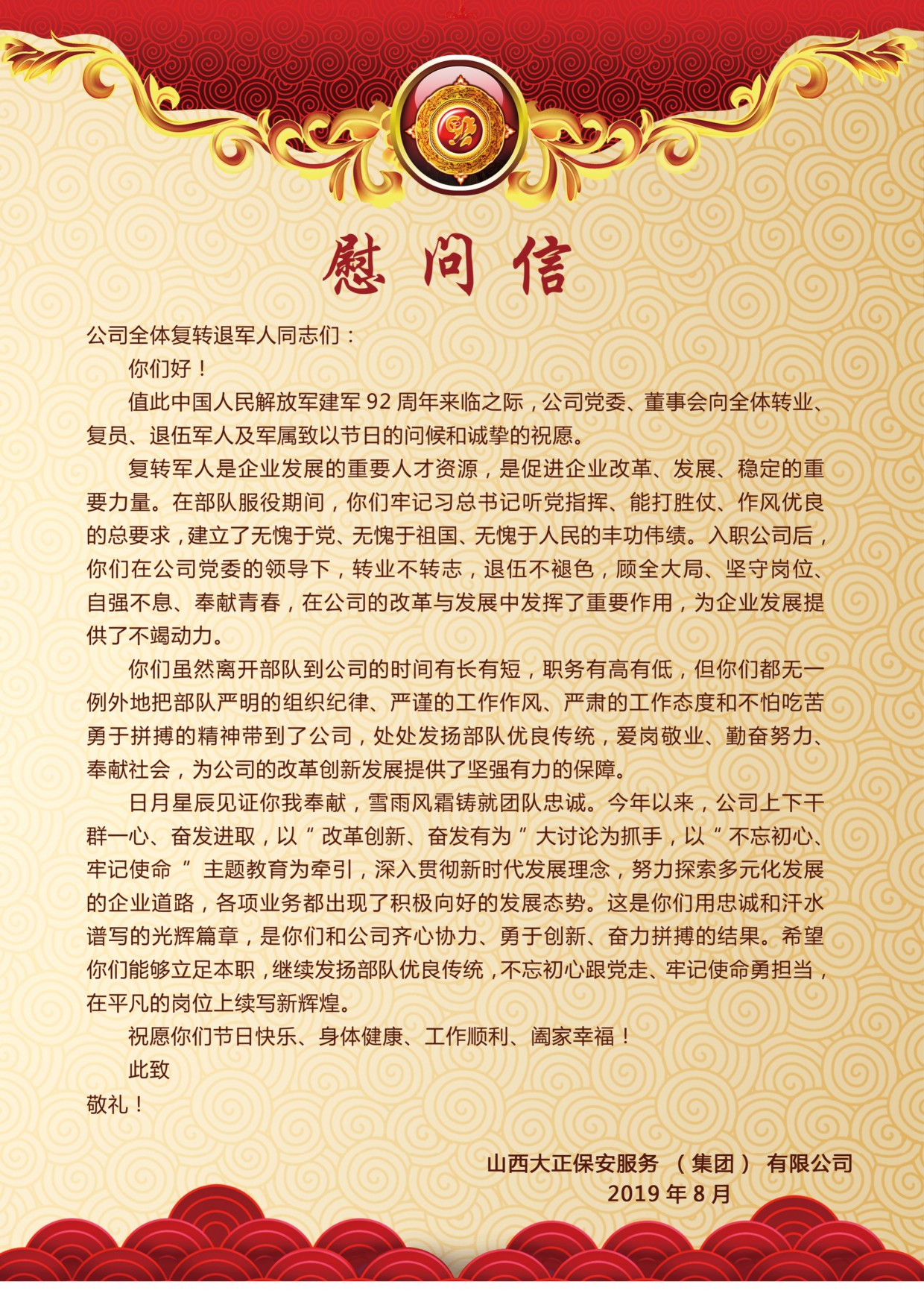 黨委委員、副總經(jīng)理趙培宏宣讀《慰問(wèn)信》,信中談到:公司的每位復(fù)轉(zhuǎn)軍人都是企業(yè)發(fā)展的重要人才資源,是促進(jìn)企業(yè)改革、發(fā)展、穩(wěn)定的重要力量,處處發(fā)揚(yáng)著部隊(duì)優(yōu)良傳統(tǒng),為公司的改革創(chuàng)新發(fā)展提供了堅(jiān)強(qiáng)有力的保障。希望大家能夠以“改革創(chuàng)新、奮發(fā)有為”大討論為抓手,以“不忘初心、牢記使命”主題教育為牽引,立足本職,發(fā)揚(yáng)部隊(duì)優(yōu)良傳統(tǒng),不忘初心跟黨走、牢記使命勇?lián)?dāng),在平凡的崗位上續(xù)寫新輝煌。